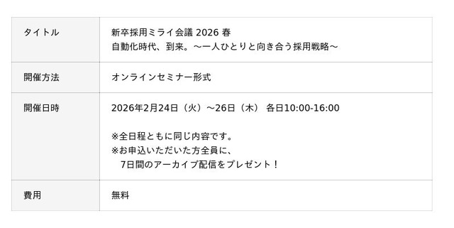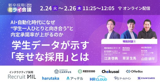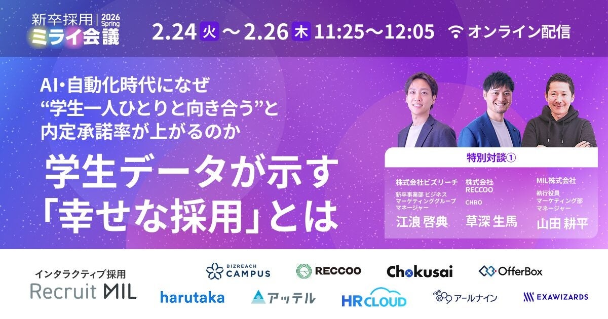 代表取締役CEO:光岡 敦、以下 MIL)は、2026年2月24日(火)~26日(木)に開催するオンラインカンファレンス「新卒採用ミライ会議 2025 秋」にて、株式会社ビズリーチ、株式会社RECCOOとの