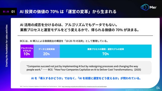 - AI投資の価値の70%が「運営の変革」から生まれるという構造