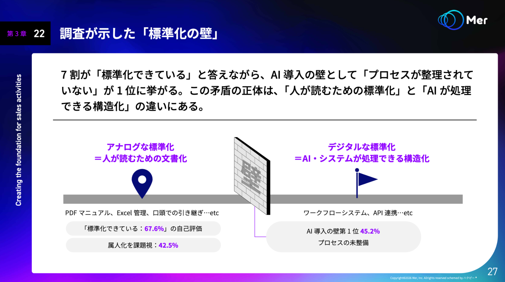 7割が「標準化できている」と自己評価する一方で、AI導入の壁として「プロセスが整理されていない」が1位(45.2%)に挙がるという矛盾が浮き彫りになりました。レポートでは、この「アナログな標準化」と「デジタルな構造化」のギャップを解消し、AI前提で業務プロセスを再設計するための具体的な道筋を明らかにしています。