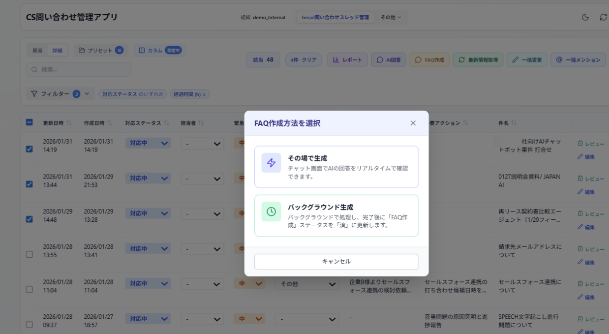 解決済みの問い合わせから、よくある質問と回答のペアを自動的に抽出し、FAQ記事として保存します。対応を重ねるほど社内のナレッジが蓄積され、次回以降の問い合わせ対応がさらに効率化されます。作成されたFAQは社内で共有され、新人教育や対応品質の標準化にも活用できます。蓄積されたFAQは、AI回答サポート機能の参照元としても活用され、回答精度の向上に貢献します。