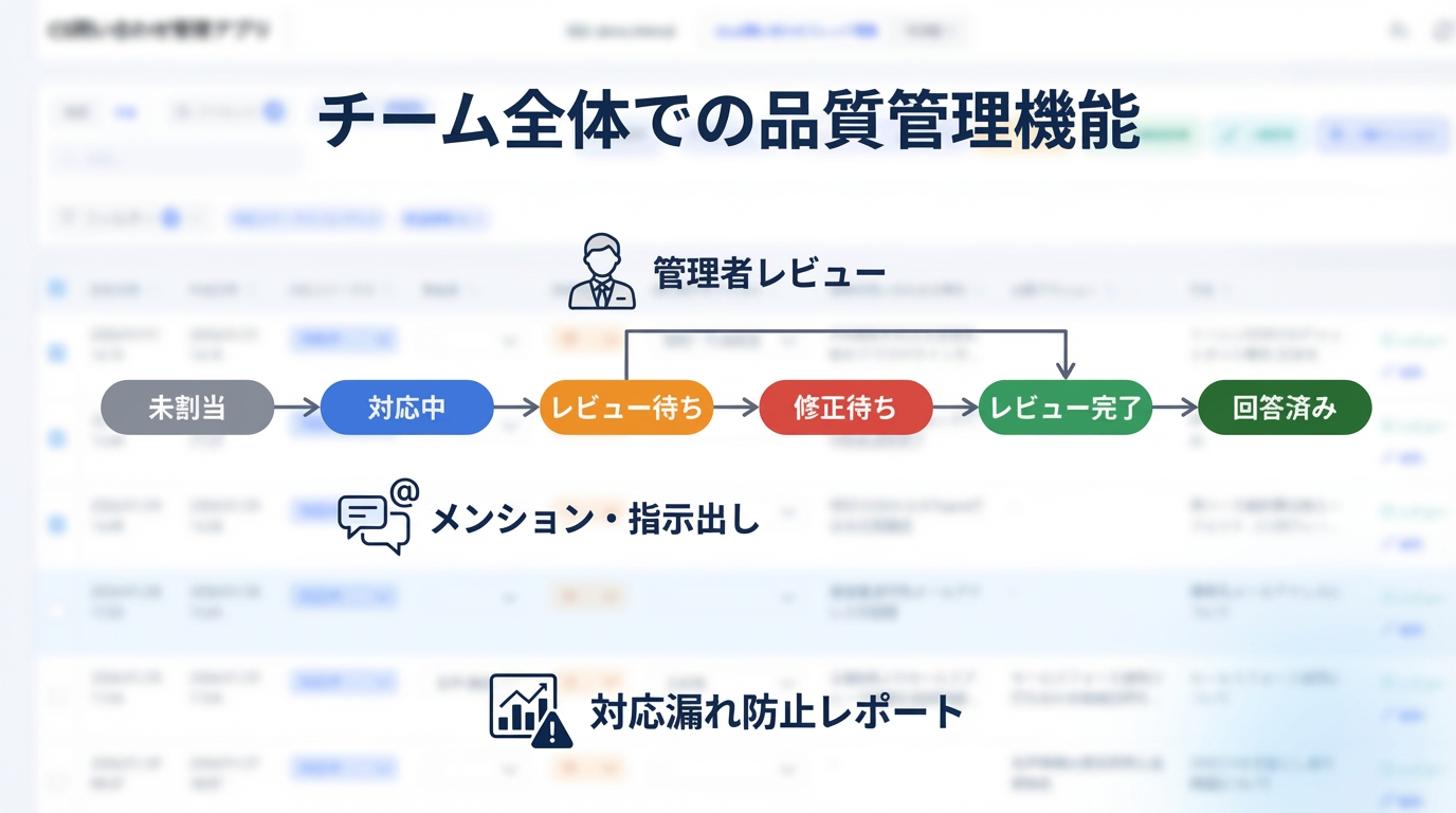 また、管理者による回答内容の確認機能を備えています。未割当、対応中、レビュー待ち、修正待ち、レビュー完了、回答済みといった詳細な状態管理により、対応の進捗を可視化します。メンション機能により、担当者への確認依頼や修正指示を円滑に行えます。