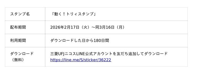 三菱UFJニコスはこのたび、三菱UFJカードのプロモーションキャラクター「トリィ」の公式LINEスタンプ最新作(全16種類)を2月17日から3月16日まで無料で配信します。