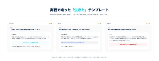 SHIGANでは、関通が社内訓練で実際に使用し、多くの社員が開封してしまった「思わずクリックしてしまう文面」や、実際の被害事例に基づいた「実録テンプレート」を提供。