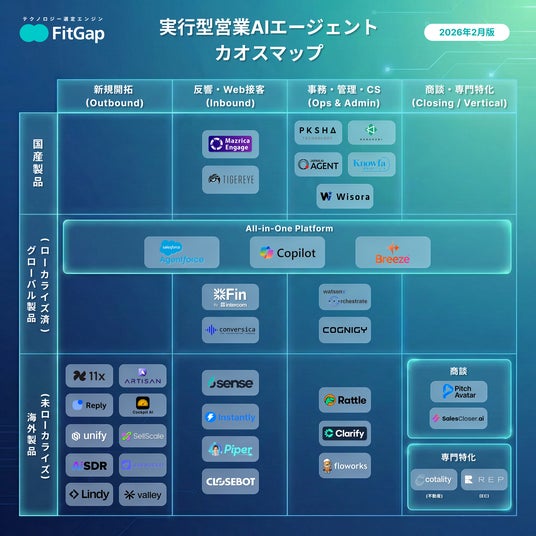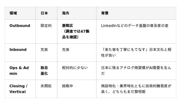 一方、国産のOutbound製品は、本マップが定義する「メール・SNS中心の自律型SDRエージェント」においては限定的です。
