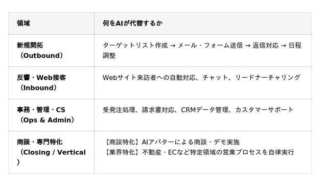 フォーム送信自動化ツールや電話AIエージェントなど、Outboundの一部を担う国産製品は存在しますが、ターゲティングからアプローチ、返信対応、日程調整までを一気通貫で自律実行する「AI社員」型の製品はまだ黎明期にあります。