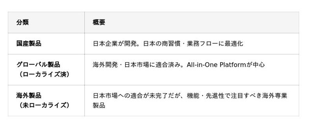 本マップでは、以下の3条件(3S)のうち 2つ以上を満たすもの を「日本市場適合(ローカライズ済)」、満たさないものを「海外製品(未ローカライズ)」と定義しています。