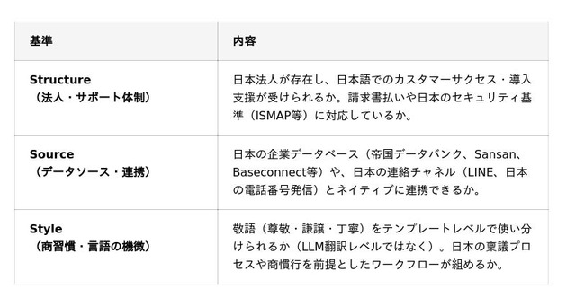多くの海外製品はLLMの能力により日本語の読み書き自体は可能ですが(Language Fit)、それだけでは日本企業が実業務で運用できるとは限りません。