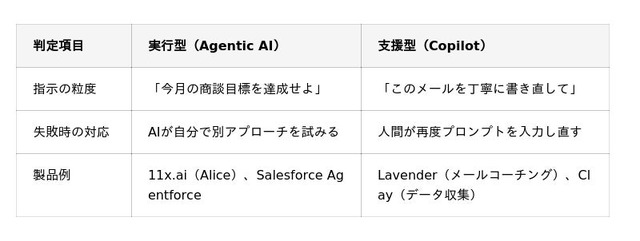 実行型は「月20件のアポ獲得」と目標を与えれば、AIが自律的に計画・実行します。支援型は人間がワークフローの中心で、実行トリガーも人間が押します。
