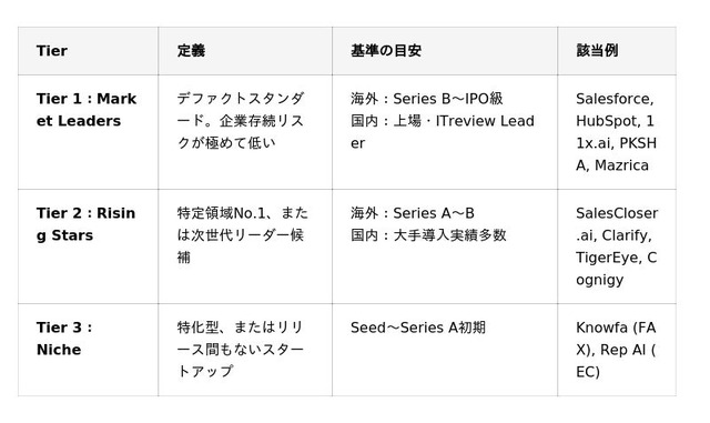 「実行型」に該当した製品群に対し、さらに市場実績に基づく3段階のTier評価を適用しました。