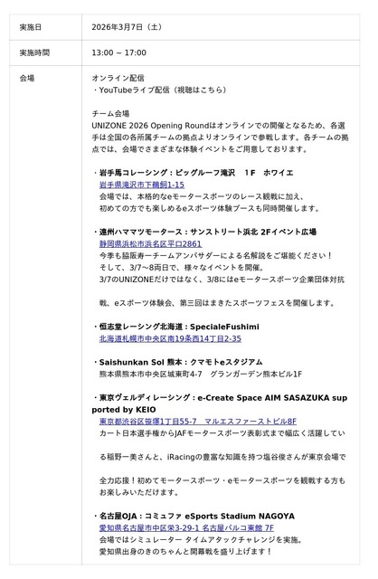 国内で唯一JAF(日本自動車連盟)の公認を受けたeモータースポーツ大会(レーシングゲームを使用したeスポーツ大会)「UNIZONE(ユニゾーン)」を運営する一般社団法人日本eモータースポーツ機構(東京都千代田区、代表理事:出井宏明、以下「JeMO」)は、2026年3月7日(土)に行われるe-Motorsport League UNIZONE 2026 Opening Roundの出場選手および実施レース内容等詳細情報をお知らせします。UNIZONE 2025に引き続き、今年も「HOME&HOME」形式で開催し、選手は全国の各チーム拠点よりオンラインで参戦します。