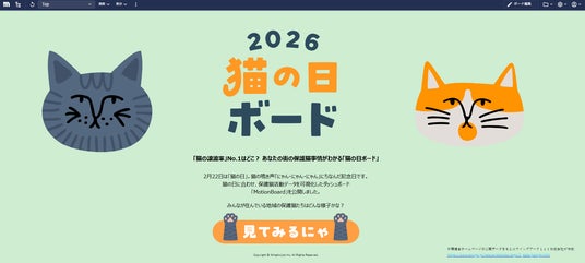ウイングアーク1st株式会社(本社:東京都港区、代表取締役 社長執行役員 CEO:田中 潤)は、2 月 22 日の「猫の日」に合わせ、社内の猫好きメンバーと共に環境省が公開している保護猫活動データを可視化したダッシュボード「猫の日ボード 2026」を公開しました。