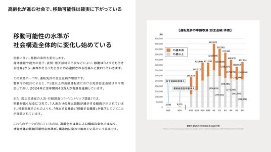 - 高齢化の進展により、免許返納や移動手段の見直しが多くの人にとって現実的なテーマになっている