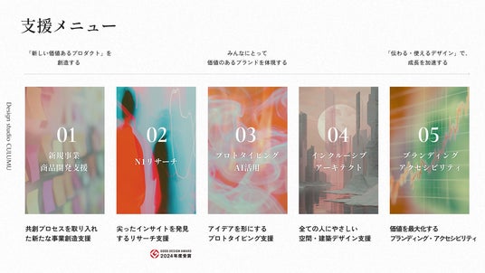 CULUMUの支援は「共創プロセスを取り入れた新たな事業創造支援」「尖ったインサイトを発見するリサーチ支援」「アイデアを形にするプロトタイピング支援」「全ての人にやさしい空間・建築デザイン支援」「価値を最大化するブランディング・アクセシビリティ支援」などがあります。