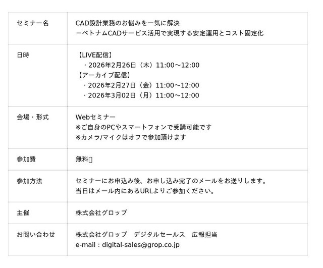 人材サービス事業を展開する[株式会社グロップ](本社:岡山県岡山市、代表取締役社長:原田 竜一郎)は、2026年2月26日(木)に【CAD設計業務 ベトナムCADサービス活用】をテーマとした、自社ウェビナーを開催いたします。本ウェビナーでは、グロップのベトナムCADサービスを活用し、設計リソースを「安定運用」させながら「コストを固定化」する具体策を解説します。