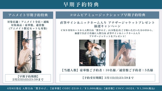 同時に、「驚きの子」の特典絵柄も公開となった。新アーティスト写真のアザーカットを使用しており、入野の魅力が詰まった表情豊かな仕上がりとなっている。