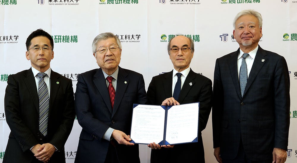 写真左より、農研機構 中川潤一 総括執行役、農研機構 久間和生理事長、東京工科大学 香川豊 学長、学校法人片柳学園 千葉茂理事長