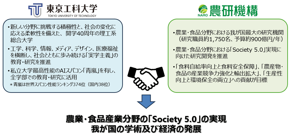 農研機構及び東京工科大学が相互に連携・協力し、相互の知的資源及び技術力を活かした共創により、持続可能な農業・食品産業の実現、我が国の学術及び経済の発展に寄与することを目的とする