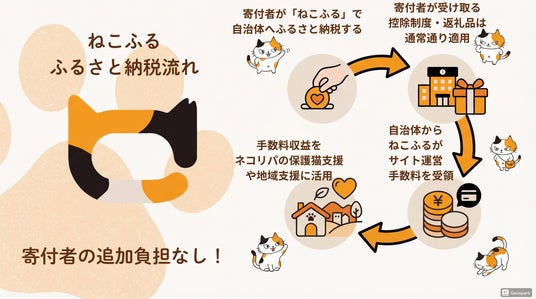 「ねこふる」は、ふるさと納税の既存制度を一切変更せず、サイトの収益をネコリパブリックの保護猫支援および地域支援へ循環させます。寄付者の負担を増やさずに猫の命を救う資金を生み出す点が、本事業の革新的な仕組みです。