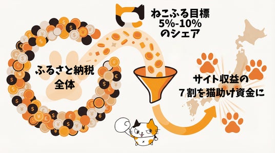 ふるさと納税は約1兆円超の市場規模を持ちます。「ねこふる」は中長期的に、市場の5~10%規模のシェアを目標とし、持続的な保護猫資金の創出を目指します。