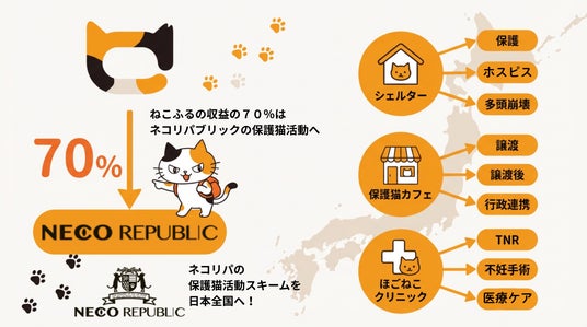 現在、ソーシャルビジネスとして保護猫活動を多拠点で展開しているネコリパブリックのノウハウを活かしを、猫を救うために保護できる場所(シェルター、ホスピス)、譲渡できる場所(保護猫カフェ、譲渡会スペース)、保護した猫たちを医療ケアできる場所、TNR活動の拠点(動物病院)、イベント(ネコ市ネコ座)などを日本全国へ広げ、圧倒的な猫助けを加速するために活用します。