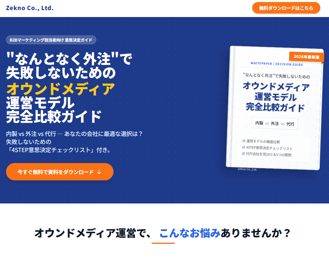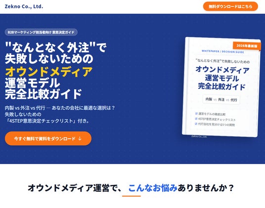 株式会社ゼクノは、B2B企業のマーケティング担当者を対象に、無料ホワイトペーパー「"なんとなく外注"で失敗しないための オウンドメディア運営モデル完全比較ガイド(2026年最新版)」を公開いたしました。