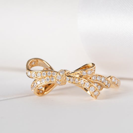 曲線に沿って贅沢にあしらわれたダイヤモンドが、指元でひときわ華やかな輝きを放ちます。シルクのような柔らかさを感じるフォルムには、リング全体に動きを持たせることで、なめらかな着け心地を実現。1本で存在感と上品な華やぎを兼ね備えたデザインです。(275,000円~)