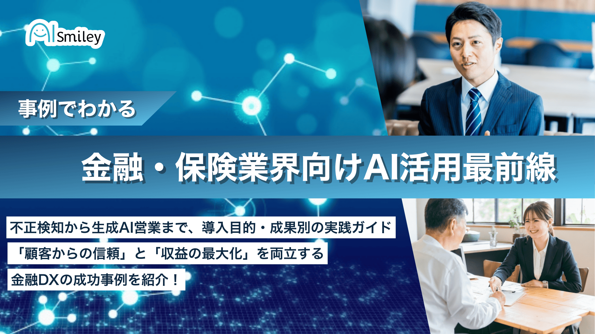 国内最大級のAIポータルメディア「AIsmiley」を運営する株式会社アイスマイリー(東京都渋谷区、代表取締役:板羽 晃司)は、金融・保険業界における最新のAI活用事例をまとめた資料「金融・保険業界向けAI活用最前線~不正検知から生成AI営業まで、導入目的・成果別の実践ガイド~」を2026年2月24日(火)に公開しました。