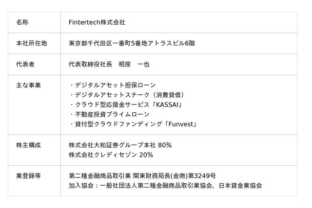 Fintertechは、大和証券グループ及びクレディセゾンがそれぞれ創業来培ってきた金融ビジネスのノウハウを礎としながら、最先端のテクノロジーの活用や外部企業との連携により次世代金融サービスを機動的にかつ柔軟に創出することを目指しています。 主な事業として、暗号資産を活用した「デジタルアセット担保ローン」及び「デジタルアセットステーク(消費貸借)」、クラウド型応援金サービスの「KASSAI」、「未来をわかちあう投資」を提供する貸付型クラウドファンディングサービス「Funvest(ファンベスト)」を展開しています。