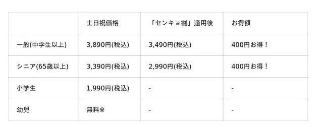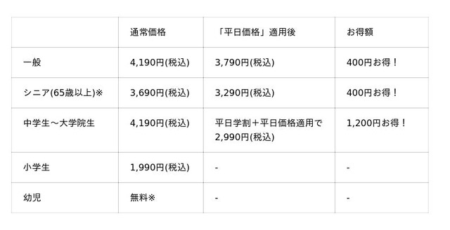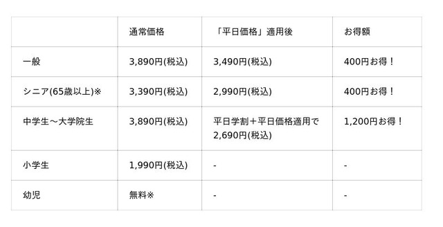 ●「平日学割」は学生証ご提示の本人に限り有効です。「平日価格」・「平日学割」はキャンペーン開催期間中の土日・祝を除く平日のみが割引適用となります。「平日価格」の対象は一般・シニア料金のお客様です。