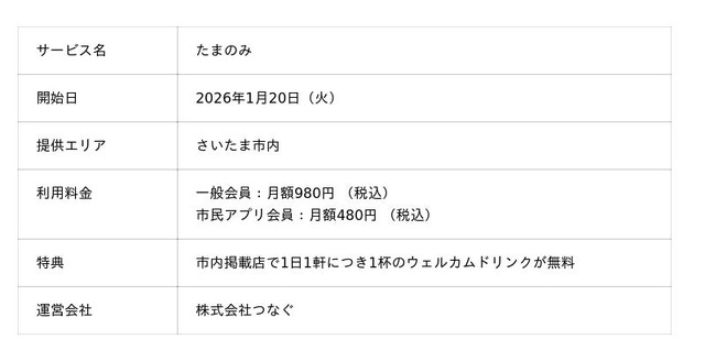 また、近年、ライフスタイルの変化により外食や飲酒の機会が減少傾向にあるなか、私たちは「たまのみ」を通じて、気軽にさいたま市内の飲食店を訪れる動機づけの仕組みを提供し、飲食店と市民または市外からの来訪者の出会いを促進することを目指しています。