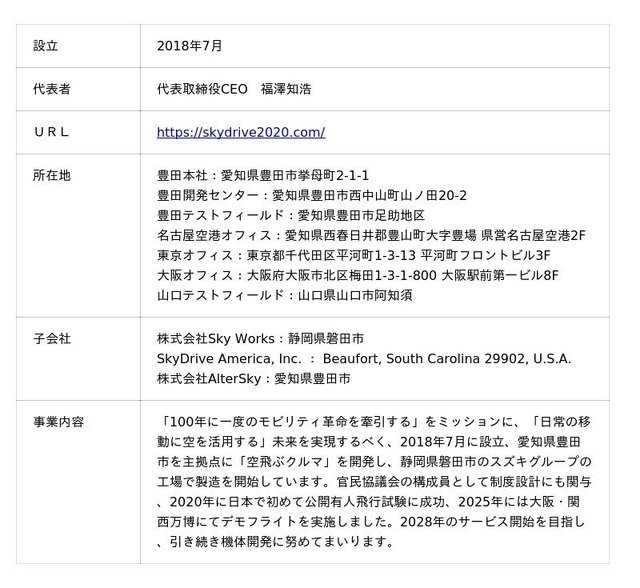 「SKYDRIVE(SD-05型)」はコンパクトで精密な飛行制御が可能であるため、既存の屋上ヘリポートの大部分での運用が可能となり得て、東京都をはじめとする都心部における空飛ぶクルマの社会実装に適した機体であると考えています。