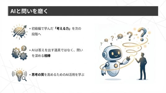 AIの特性を正しく理解し、AIと一緒に「考える力」を育てるための土台を築きます。AIは確率に基づく予測で回答するため、最終的な「意味づけ」や「価値判断」は人間の役割であることを学びます。