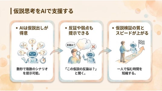 AIとのやり取りを通じて、自身の思考を構造化し、アウトプットの質を高めていく要点を習得します。AIに全面的に任せるのではなく、目的や背景、制約条件を言語化して伝える「思考設計」の重要性を学びます。