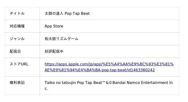 ・Apple Arcade版(太鼓の達人 Pop Tap Beat):2026年3月配信予定