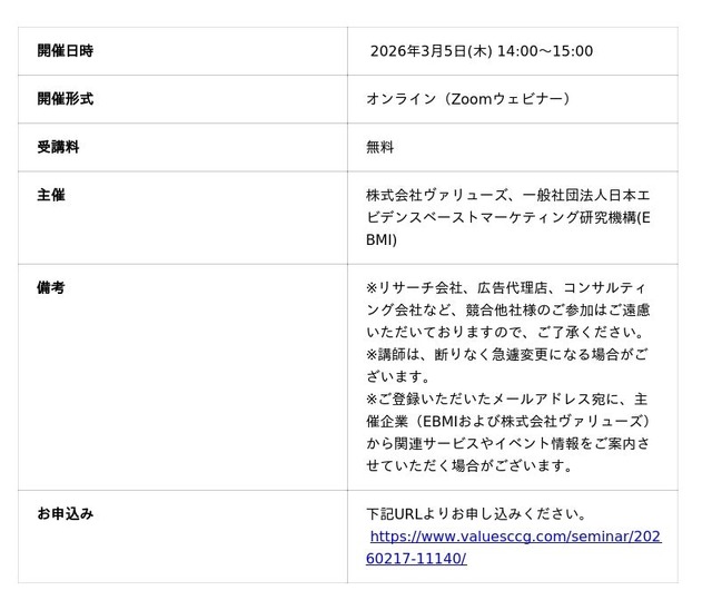 インターネット行動ログ分析によるマーケティング調査・コンサルティングサービスを提供する株式会社ヴァリューズ(本社:東京都港区、代表取締役社長:辻本 秀幸、以下「ヴァリューズ」)と一般社団法人日本エビデンスベーストマーケティング研究機構(代表理事:木田浩理、以下「EBMI」)は、2026年3月5日(木)に、無料オンラインセミナー「コンバージョンの獲得効率と強い相関を持つ『ブランド想起』の力とは」を共催いたします。