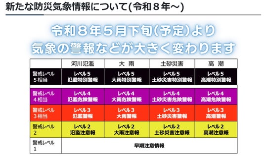 図1)令和8年5月下旬(予定)から変更される新たな防災気象情報の体系(警戒レベルとの対応)