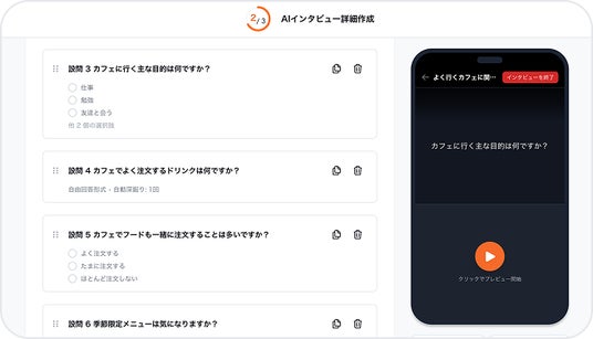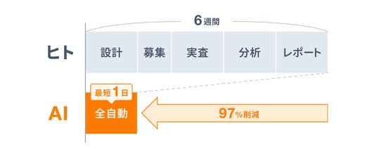 このような背景のもと、米国ではListen LabsやOutset.aiといったAIリサーチ企業が100億円規模の調達を行うなど、グローバルで「AIエージェントによるデプスインタビュー調査」が主流になりつつあります。そういった中、セルフ型のインタビューサービスとしてNo,1の実績(※)を持つ当社が、AIを活用し、従来のデプスインタビュー調査が持つ「高い実施ハードル」と定量調査の「情報量の薄さ」という課題を同時に解消することを目指します。