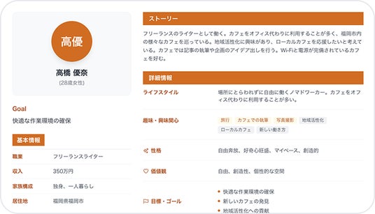 回答に基づき「ペルソナ」や「カスタマージャーニーマップ」を自動生成。AIとチャットで対話しながらセグメント分析も可能。