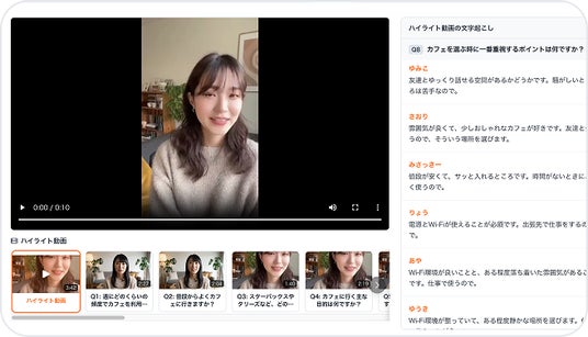 インタビューは録画され、回答内容は自動で文字起こし。ローデータとして閲覧・ダウンロードが可能。