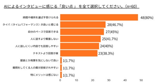 ユーザーのAIインタビューに対する利点としては、「時間や場所を選ばず受けられる」(80%)といった柔軟な調査体験が最も評価されました。加えて、「自分のペースで回答できる」(45.0%)、「人に話すより緊張しない」(41.7%)など、対人インタビュー特有の心理的ハードルを下げる点も支持されています。こうした“負担が少なく続けやすい”体験は、前述の「アンケート離れ」や不正回答の増加といった課題に対して、回答継続率と回答品質の両面から改善につながる可能性を示唆しています。