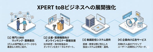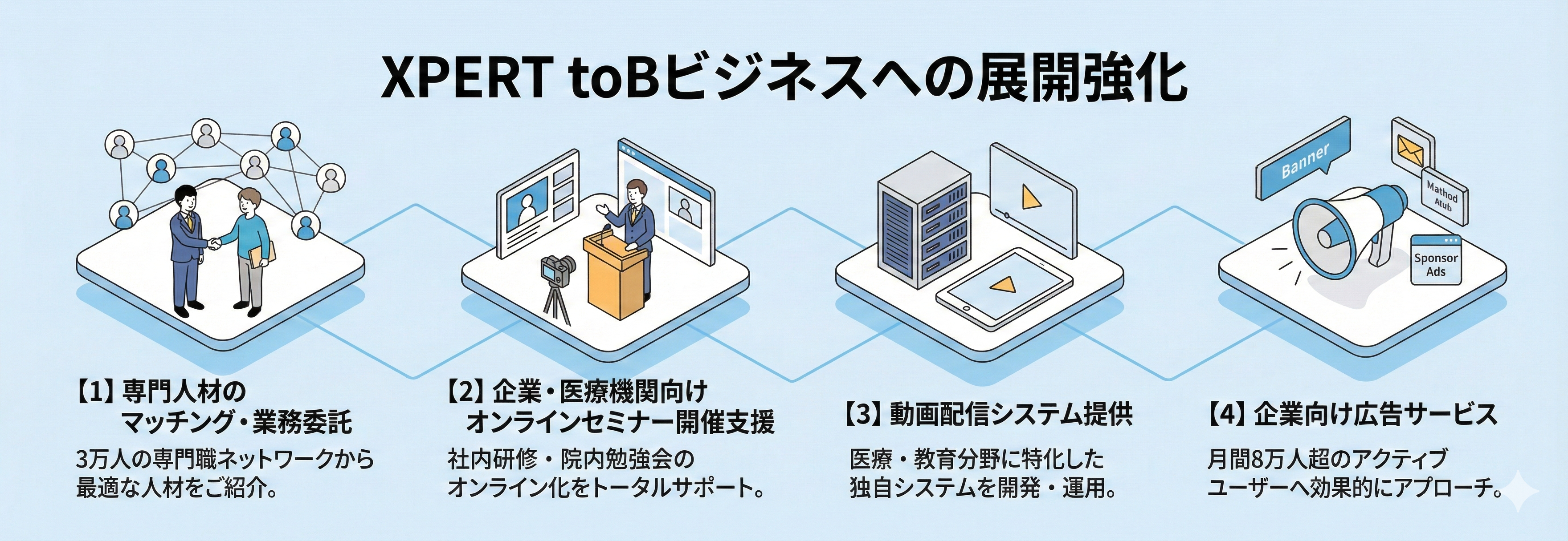 3万人の専門職会員基盤と、月間8万人以上のアクティブユーザーを活かし、XPERTは企業・医療機関向けのBtoBソリューションを強化してまいります。【1】専門人材のマッチング・業務委託