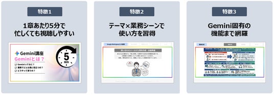 各章の講座時間が5分以内になるよう制作しており、Geminiの使い方が気になった際や、業務の合間に手軽に視聴ができる設計です 。▼特徴2:テーマ×ケーススタディで、業務シーンに応じた使い方を習得できる