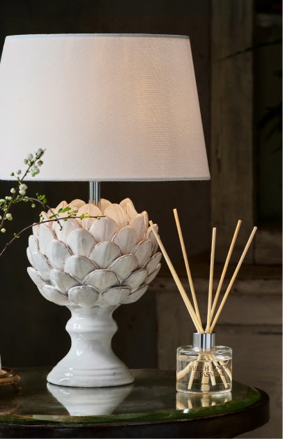 自然の造形美から着想を得た、アーティチョークモチーフのテーブルランプ。光沢のあるアイボリーカラーのセラミックベースが、クラシカルでありながら洗練された佇まいを演出し、空間にやさしい華やぎを添えます。