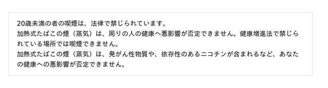 BATグループでは、たばこ製品のマーケティングを適切に実施するために国際的な自主規準を設定しています。そのため消費者に対するたばこ製品に関するすべてのコミュニケーションには、20歳未満の方へのコミュニケーションをお控えいただくとともに、「喫煙と健康に関する注意文言」を表示することを関係各位にお願いしております。加熱式たばこに関しては、記事掲載していただく際には、「健康に関する注意文言」が表示されるようご配慮いただきたく存じます。ご協力の程、何卒よろしくお願い申し上げます。