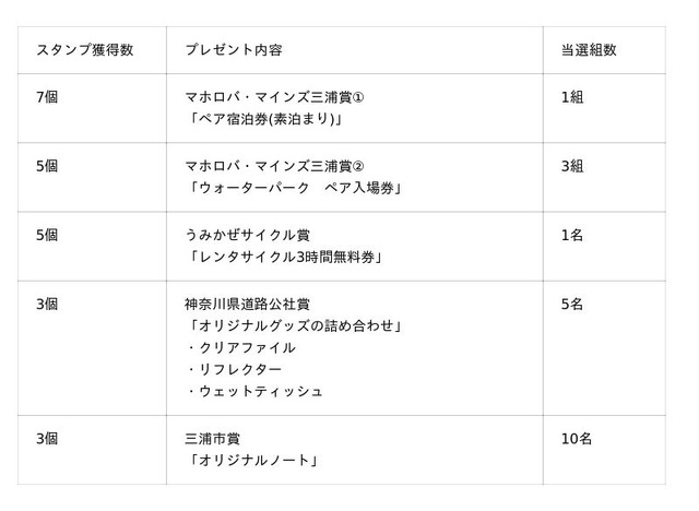 また、スタンプを集めた方は、三浦市内のリゾートホテルの宿泊券など、三浦の魅力を体感できる豪華賞品が当たるプレゼント企画に応募できます。