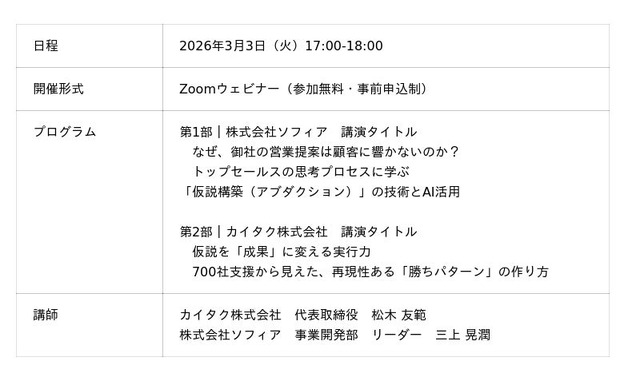 第1部では、株式会社ソフィアが「営業個人の思考力強化」について解説します。 トップセールスはどのように顧客の変化を察知し、仮説を立てているのか? その「仮説構築(アブダクション)」のプロセスを紐解き、AIを活用してチーム全体の思考の質を高める、次世代の育成メソッドを公開します。
