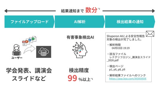 本サービスは、講演会スライドや学会発表資料などから、AIが有害事象の有無を99%以上(*1)の精度で自動判定するソリューションです。従来、人の目視に依存していた確認作業をAIが高度に補完。1ファイルあたり10分以内(*2)での高速検知により、報告漏れリスクの極小化と、確認工数・外部委託コストの削減を同時に実現します。