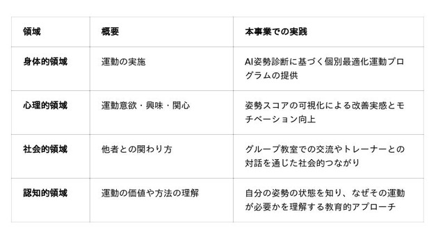 AI姿勢診断により、参加者本人が「自分の姿勢の変化」を数値とビジュアルで確認できるため、改善の実感と継続意欲の向上につながりました。これはフィジカルリテラシーの「心理的領域」と「認知的領域」の両方に働きかける仕組みでもあります。