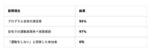 ・ 参加者の運動実践者74%、実践意欲含め97%により、教室外での運動継続が実現