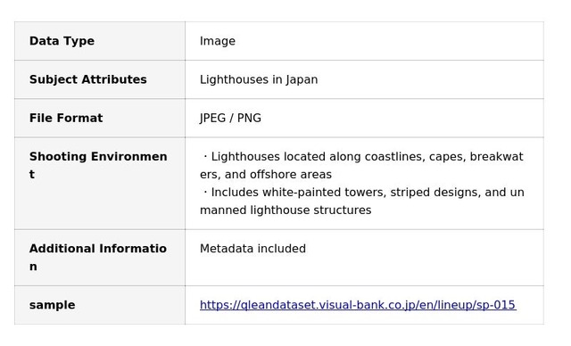 Visual Bank Inc. (Minato-ku, Tokyo; CEO: Saneyuki Nagai) has released the Japanese Lighthouse Image Dataset under its AI training data solution, Qlean Dataset, through its subsidiary amanaimages Inc. The dataset is designed to support AI development and research, including object detection, image classification, and multimodal AI applications.